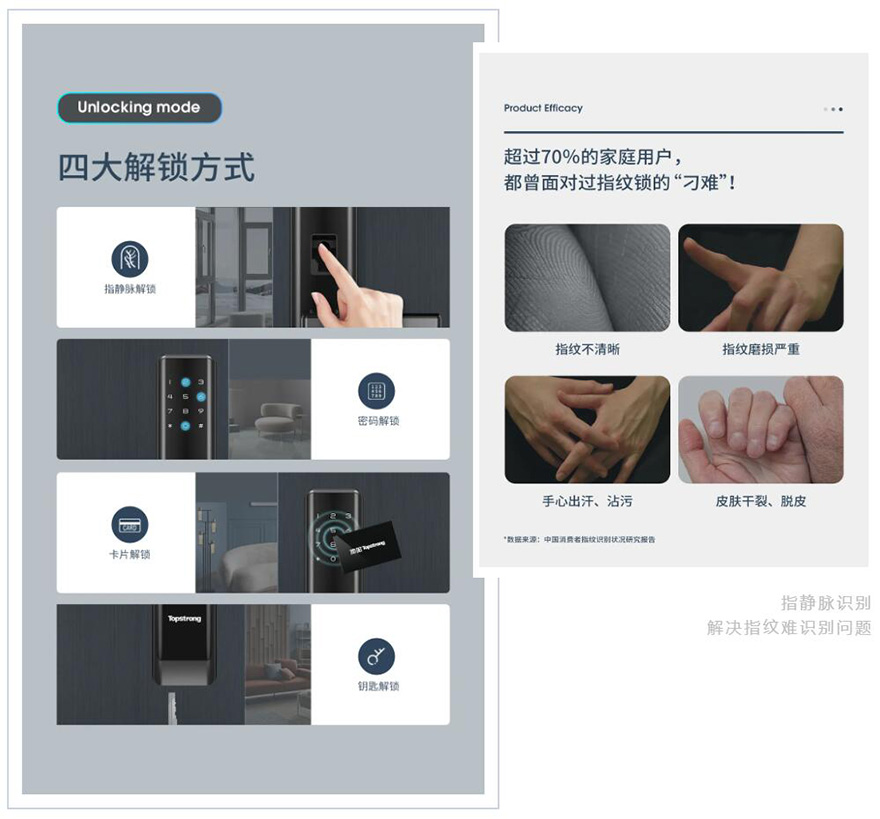 ●指纹方式应用比较广泛,但是问题也并不是没有。比如:容易被复制,安全性差;老人小孩指纹浅,识别不够灵敏。