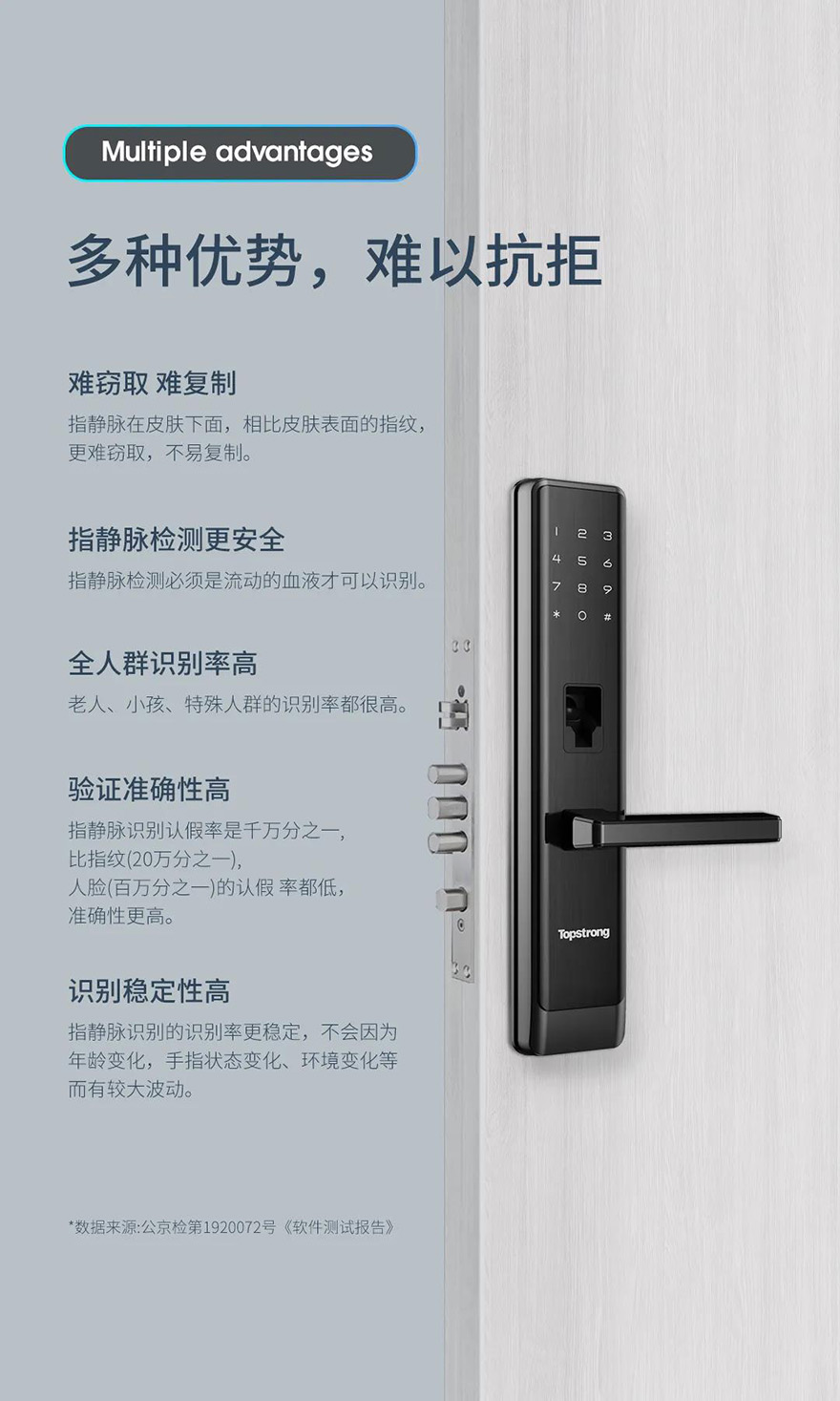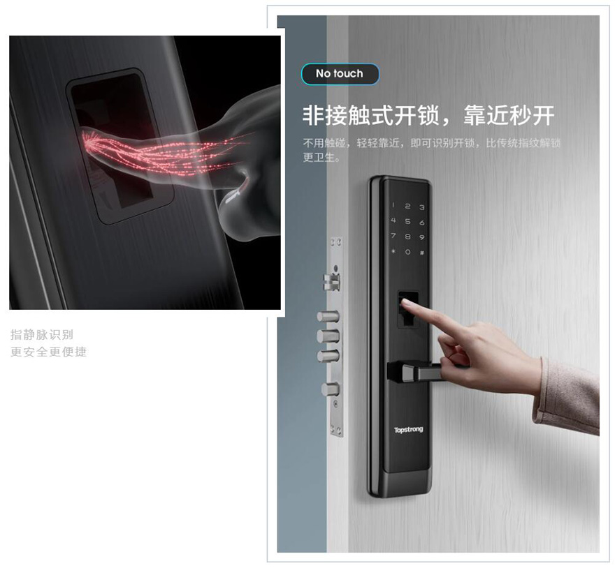 它的核心科技在于:通过检测藏在皮下的静脉信息,手指静脉中流动血液里的血红蛋白吸收红外光,从而获取静脉流动信息,进而对比验证,相较于指纹锁,指静脉识别更难窃取,更难复制,而且稳定性高,真的很适合有老人孩子的家庭。
